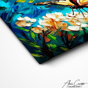 Notre tableau moderne papillon capture la beauté éclatante de la nature en plein essor. Les teintes vives de bleu, de vert et d’orange se mêlent dans une composition lumineuse qui respire la fraîcheur et la vie. Idéale pour insuffler une touche de joie à votre décoration murale, elle symbolise la légèreté et le renouveau. Un choix parfait pour égayer votre espace avec douceur et couleur.