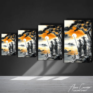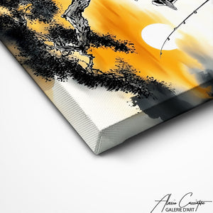 Notre tableau zen Japandi met en scène deux moines contemplant le lever du soleil. Les tons sobres et apaisants rappellent la philosophie wabi-sabi, où chaque détail respire la sérénité. Parfaite pour une décoration minimaliste et spirituelle, elle invite à la méditation et à la détente. Fabriquée sur toile premium, cette œuvre allie authenticité et excellence.
