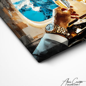 Notre tableau luxe champagne illustre un toast au champagne depuis les hublots d’un jet privé, face à une vue spectaculaire sur les Alpes. Symbole d’élégance et de réussite, il sublime les intérieurs sophistiqués.