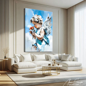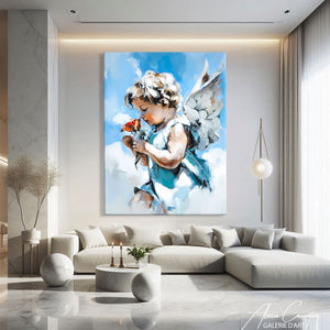 Notre tableau ange blanc représente un bébé ange tenant une fleur dans la main. Doux et poétique, il évoque pureté et innocence. Une œuvre idéale pour une décoration tendre et lumineuse.