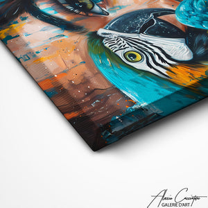 Ce tableau femme perroquet combine la grâce féminine avec la beauté sauvage de l'oiseau. Une œuvre originale et expressive, parfaite pour une décoration artistique qui mélange élégance et exotisme