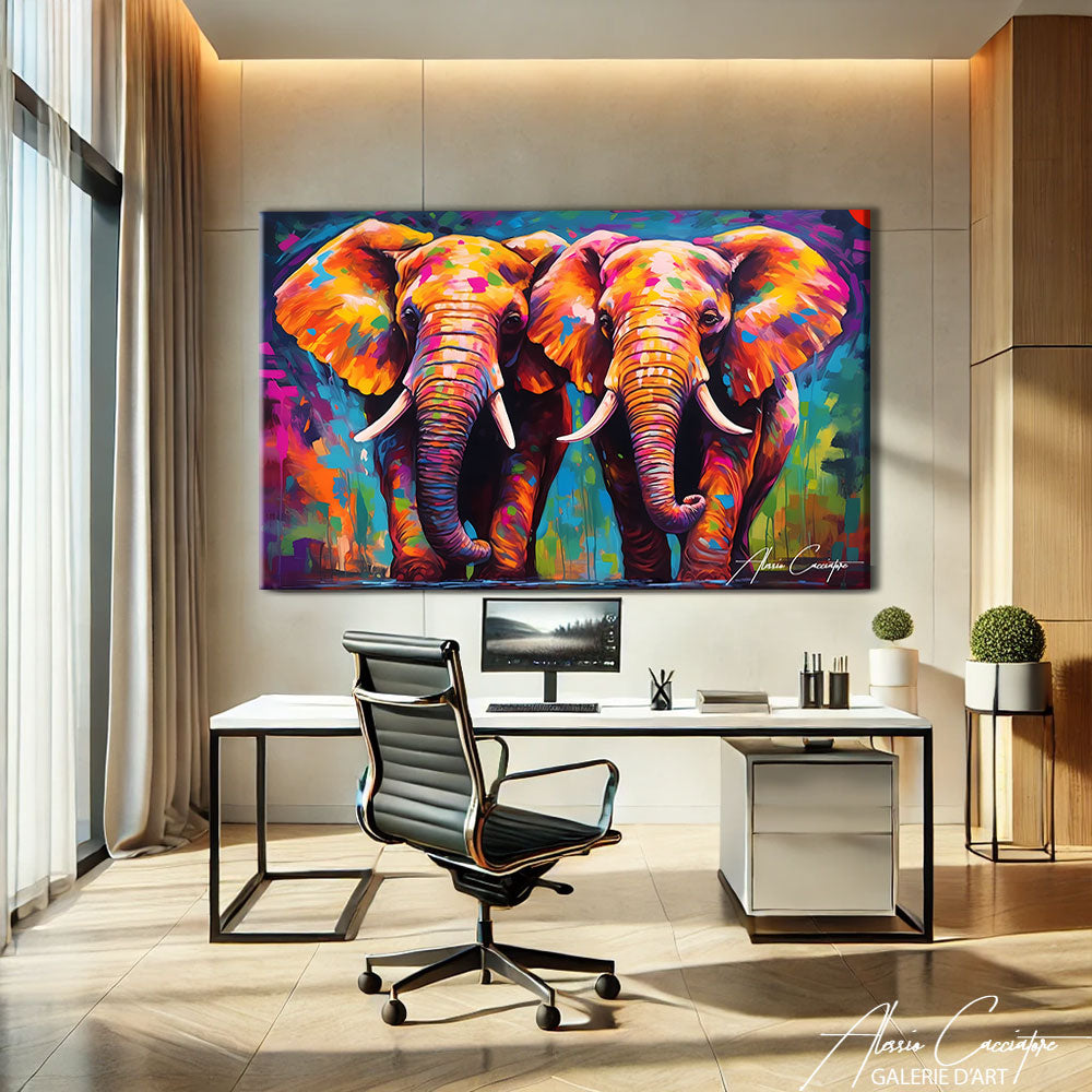 Ce tableau avec des éléphants est une oeuvre qui transmet l'émotion et la fascination que suscite cet animal emblématique, rappelant au spectateur la beauté et la fragilité de la vie sauvage
