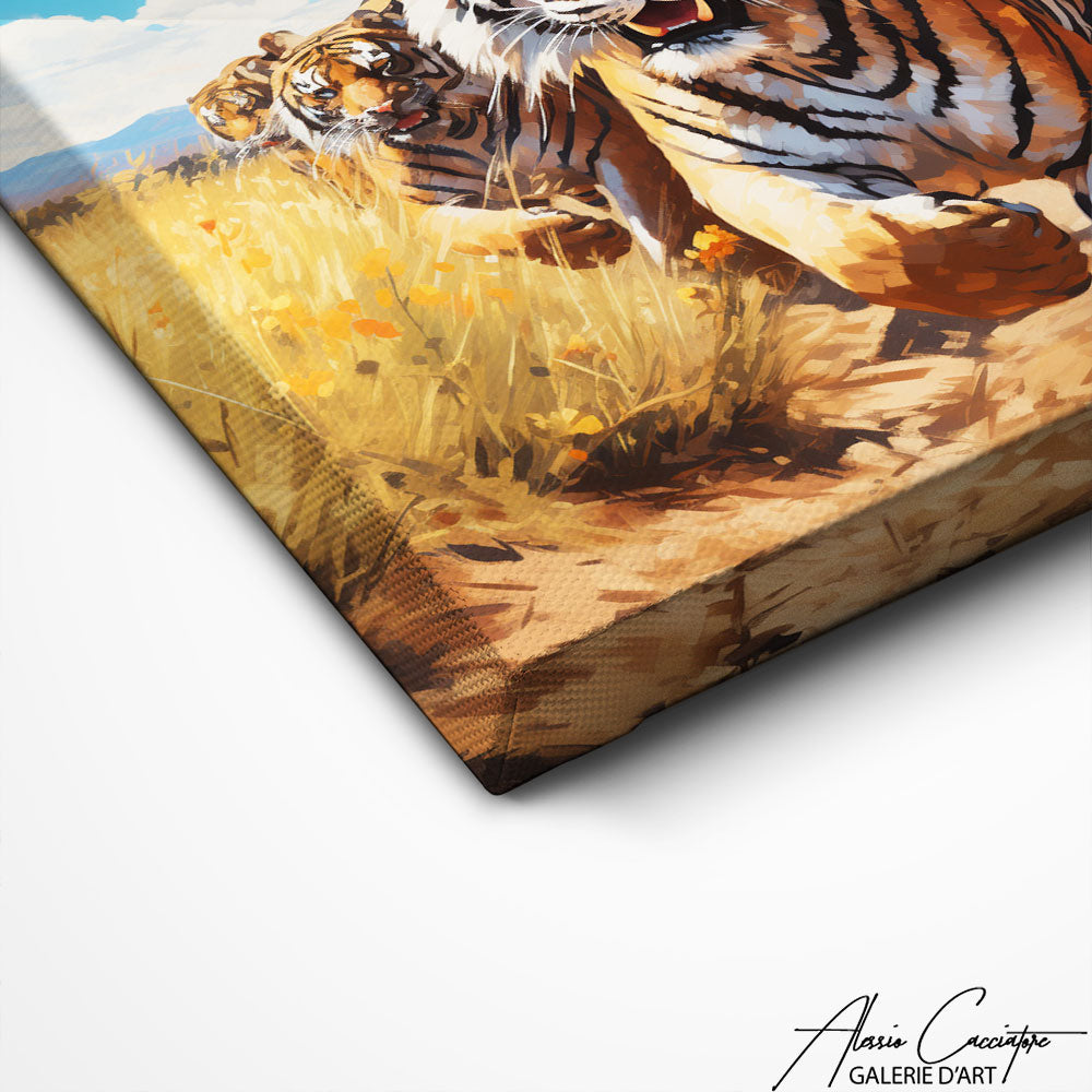 Le tableau des tigres est un hommage à la majesté et à la force collective de ces créatures. Chaque tigre, représenté avec une précision exquise, raconte une histoire de survie, de puissance et de beauté sauvage.