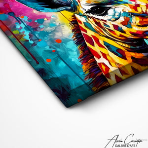 Pour cette œuvre, l'artiste a décidé de capter l'essence vibrante de l'animal, où chaque nuance évoque la richesse de son habitat naturel pour créer ce tableau girafe en couleur.