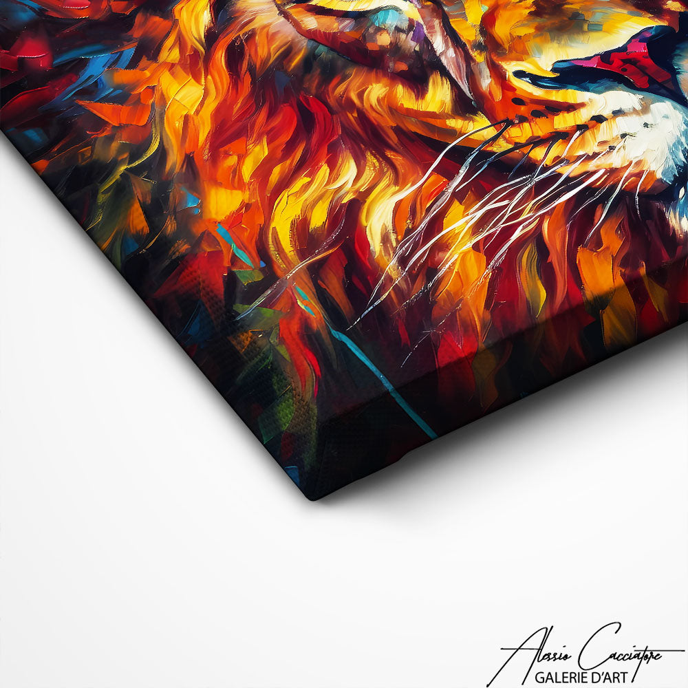 Les couleurs vives de ce tableau lion créent un sentiment de chaleur et d'énergie qui ne manquera pas de captiver tout spectateur. Cette oeuvre est qui mérite d'être admiré et conservé précieusement.