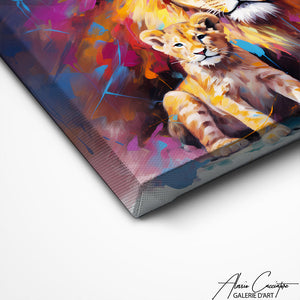 Empli de tendresse et de force, notre tableau lion et lionceau capture un moment intime entre la puissance protectrice et la vulnérabilité. Idéal pour créer une atmosphère chaleureuse.