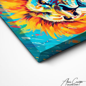 Chaque détail ont été capturé pour ce tableau lion lumineux, évoquant un sentiment de force tranquille. Imaginez ce tableau comme le point focal de votre salon, où il apportera une dose de nature sauvage à votre espace urbain.