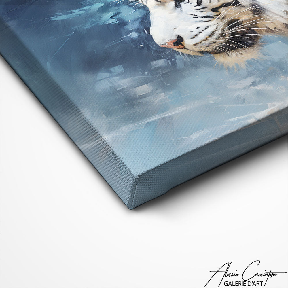 Ce tableau d'un tigre blanc, rare et mystique, est une célébration de la pureté et de la grâce. Ses nuances subtiles et son expression paisible apportent une touche de sérénité et d'élégance à tout espace de vie.