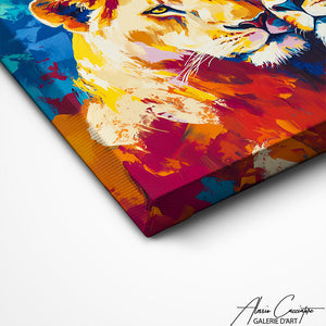 Illuminez votre espace avec notre tableau lion multicolore, où des teintes colorées se mêlent pour créer une interprétation dynamique de ce puissant prédateur. Parfait pour ceux qui souhaitent ajouter une touche artistique et audacieuse à leur intérieur.