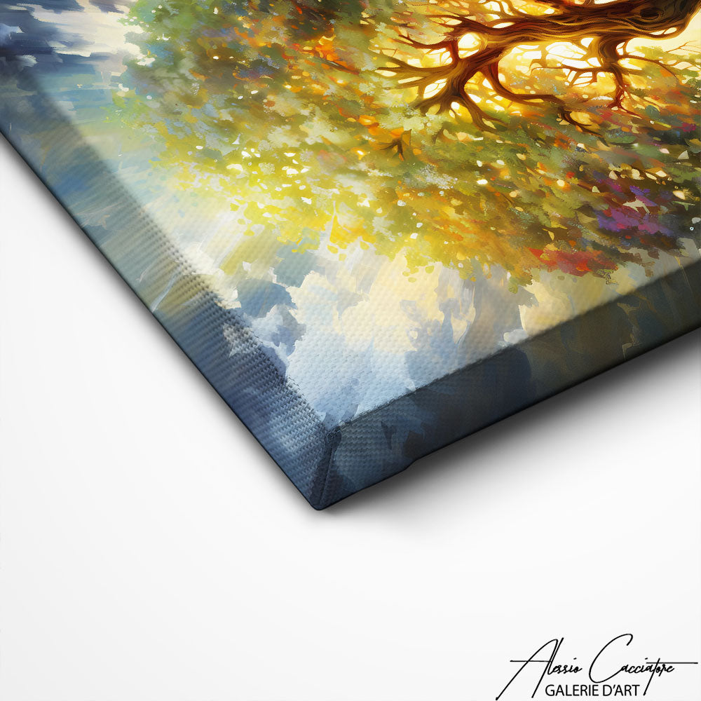 Ce tableau incarnant l'Arbre de vie est une véritable ode à la force et à la persévérance, représentant l'unité et la continuité dans un style visuel saisissant. Une pièce d'art exceptionnelle qui apporte une touche de sagesse et d'élégance naturelle à tout intérieur.