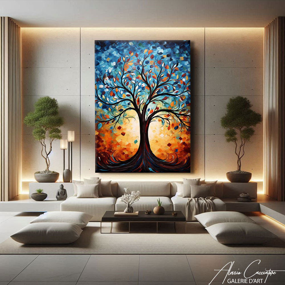 Ce tableau Arbre de vie bleu est sublimé par des nuances de bleu, il invite au rêve et à l'évasion. Cette couleur, évoquant le ciel et l'eau, symbolise la sagesse, la sérénité et l'infini