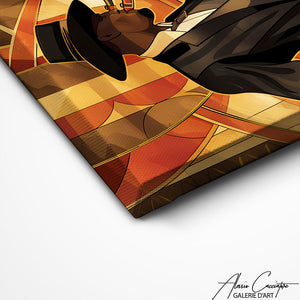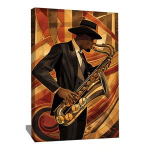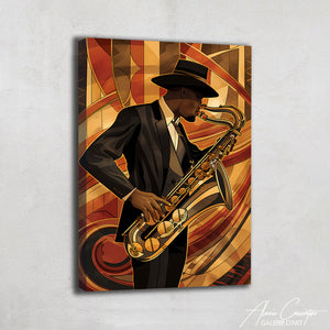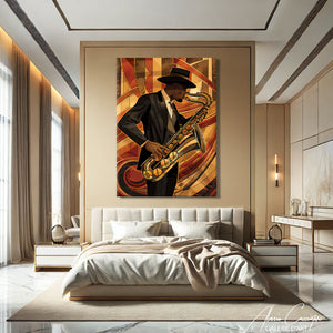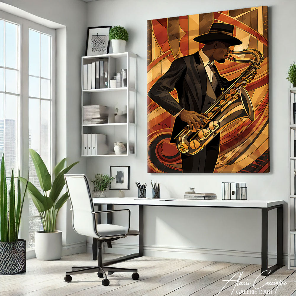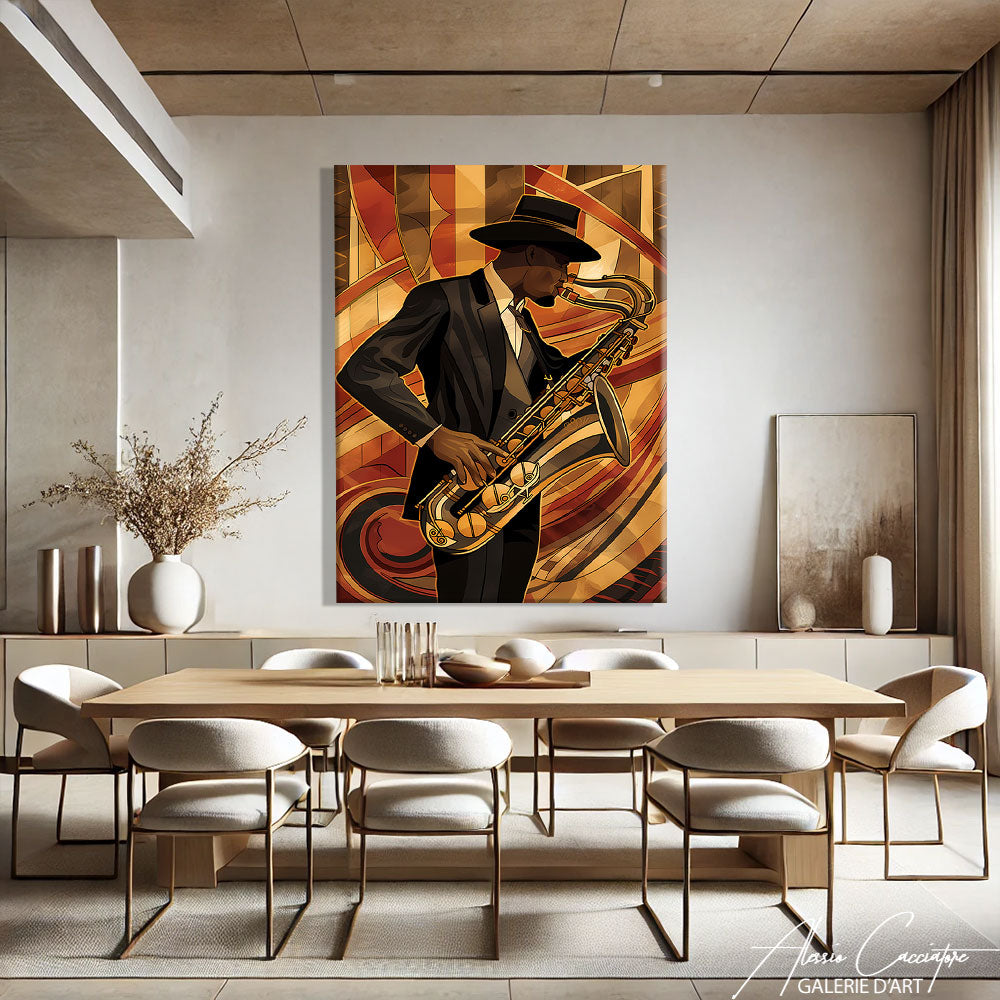 Notre tableau Art Déco représente un saxophoniste en pleine performance, sublimé par des lignes élégantes et des contrastes raffinés. Inspiré du style des Années Folles, il mêle géométrie sophistiquée et ambiance jazz, apportant une touche de dynamisme et de glamour à votre intérieur. Idéal pour une décoration chic et artistique, il insuffle une atmosphère à la fois vintage et moderne, parfaite pour un salon ou un espace musical.