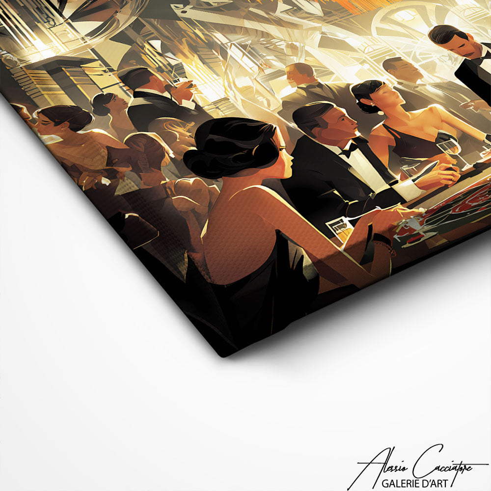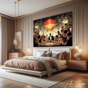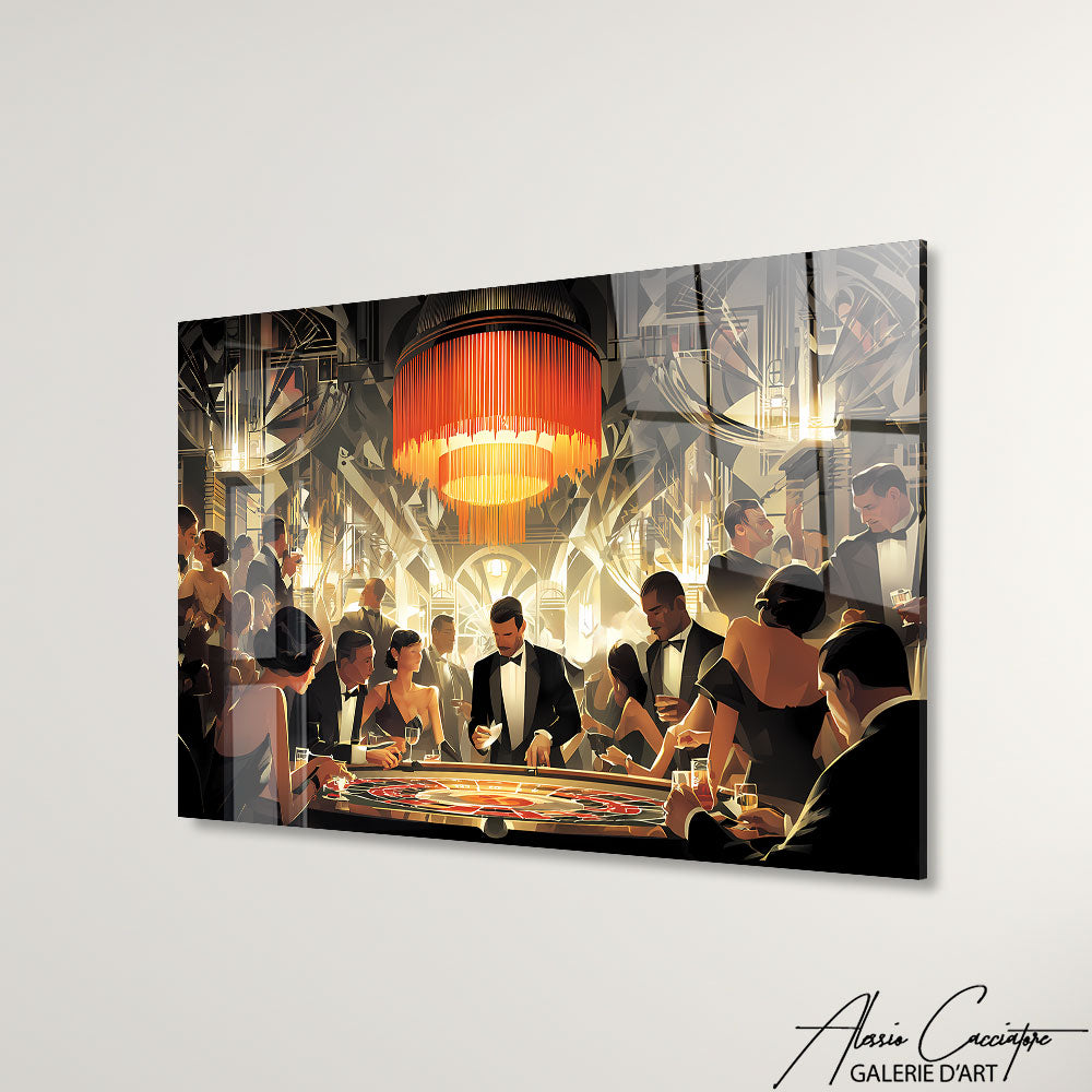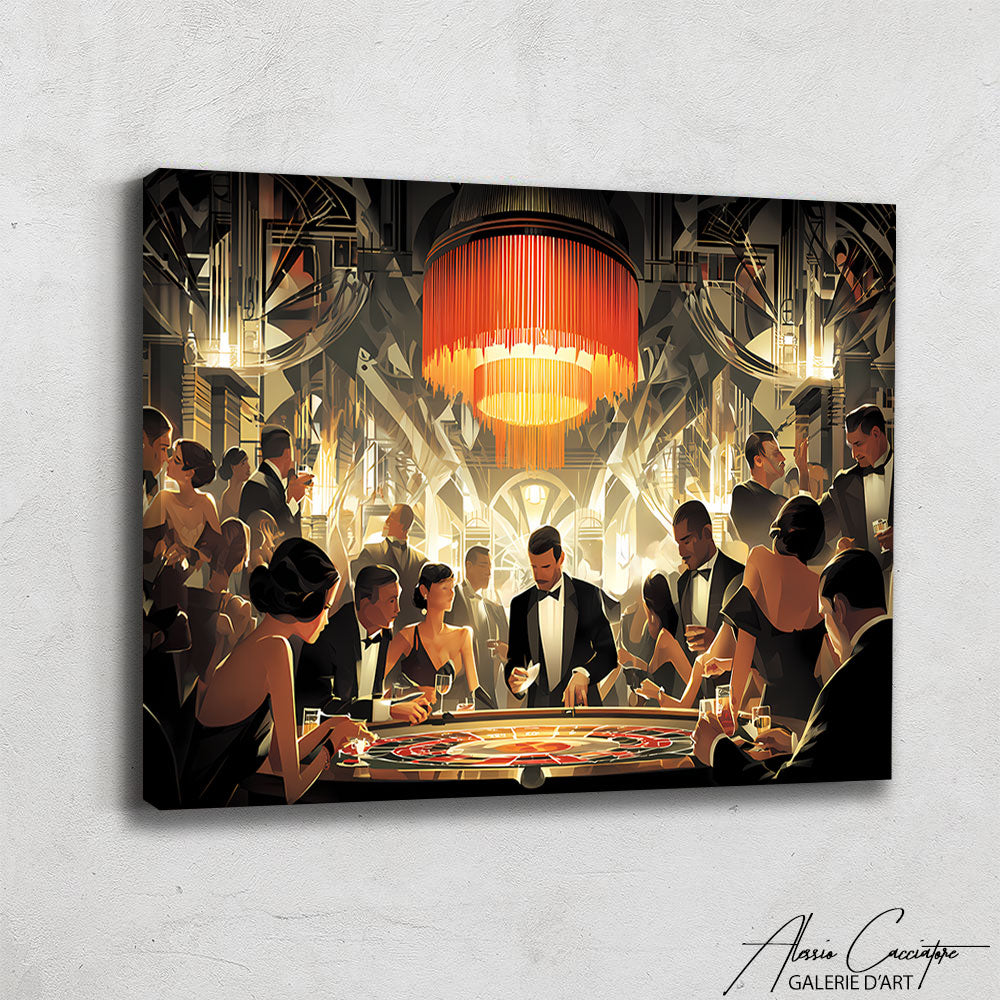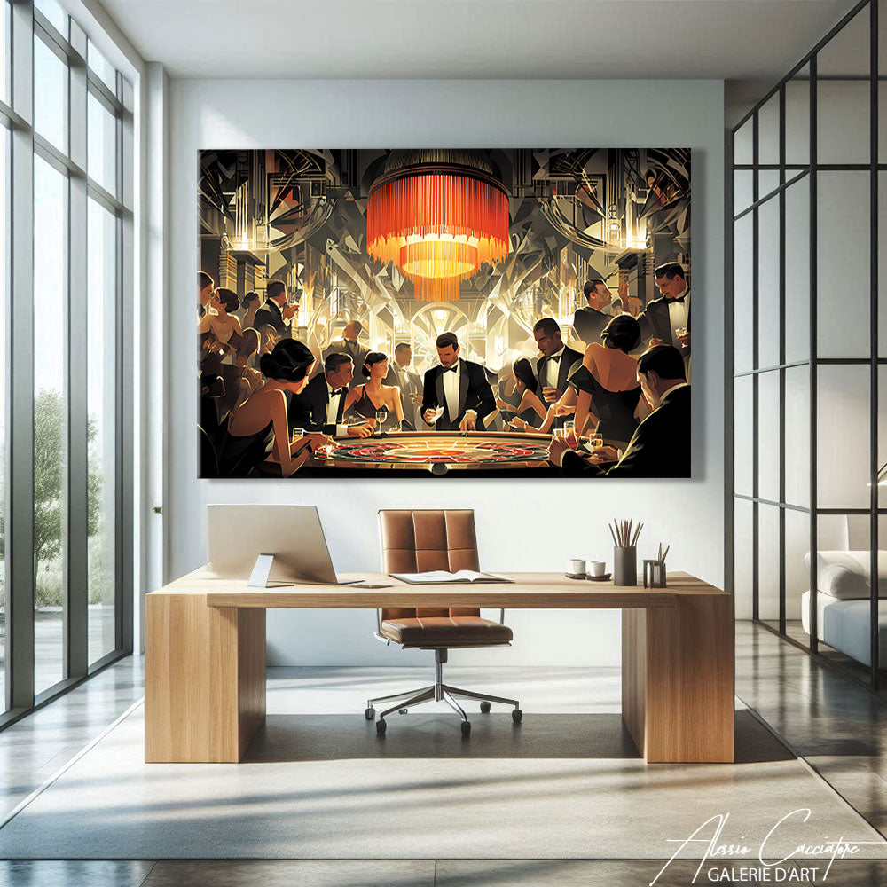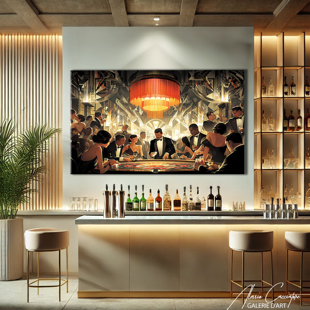 Notre tableau de casino art déco illustre une salle élégante avec roulette et joueurs en smoking. Raffiné et luxueux, il respire glamour et exclusivité. Idéal pour donner prestige et élégance à vos murs.