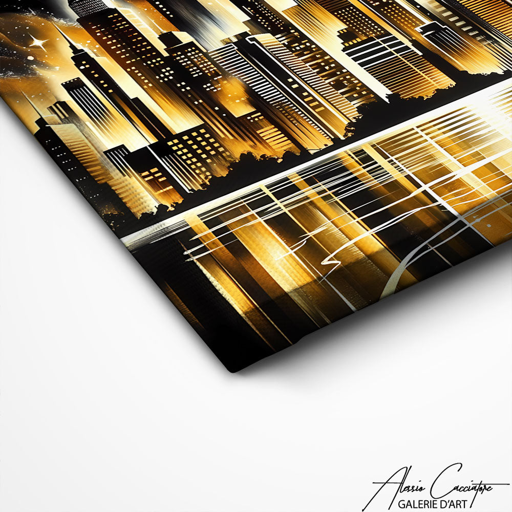 Notre tableau New York Art Deco représente une skyline nocturne s’illumine sous une lune dorée aux reflets métalliques. Les gratte-ciel géométriques se reflètent dans l’eau, créant une symétrie élégante. Les tons or et noir donnent une ambiance luxueuse et urbaine. Un visuel sophistiqué, parfait pour une décoration moderne et structurée.