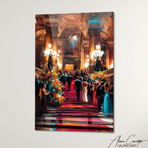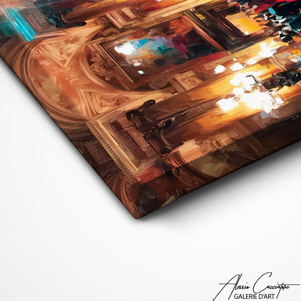 Notre tableau chic art déco illustre l’intérieur d’un opéra coloré où se mêlent élégance et raffinement. Inspiré de l’art déco, il respire luxe et distinction. Parfait pour habiller un salon ou un bureau élégant.