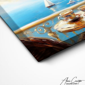 Notre tableau mural café transporte votre regard vers une terrasse ensoleillée surplombant la mer. Deux tasses de café trônent sur une table face à l’horizon, symbolisant la détente et la douceur de vivre. Les nuances bleues et dorées insufflent un air de vacances et de sérénité. Une œuvre parfaite pour les amoureux de la mer et des moments de calme partagés.