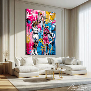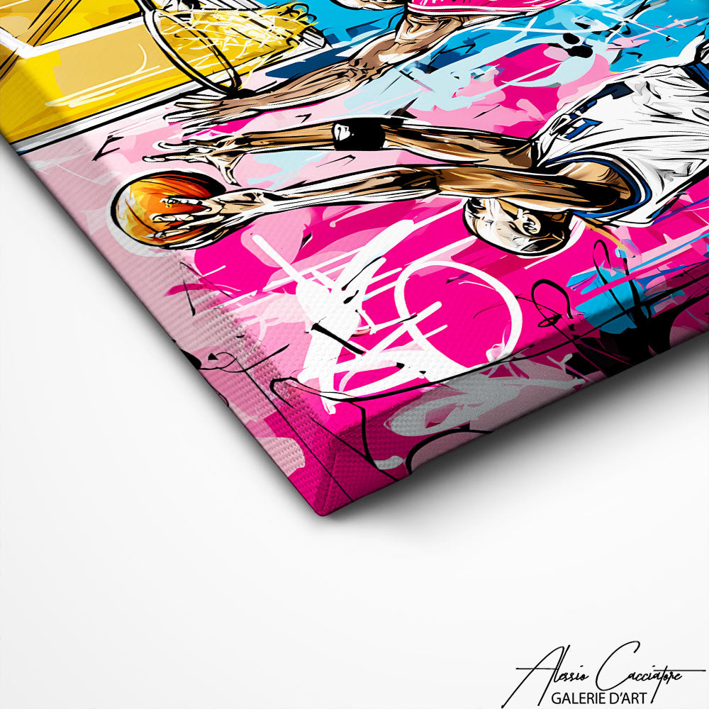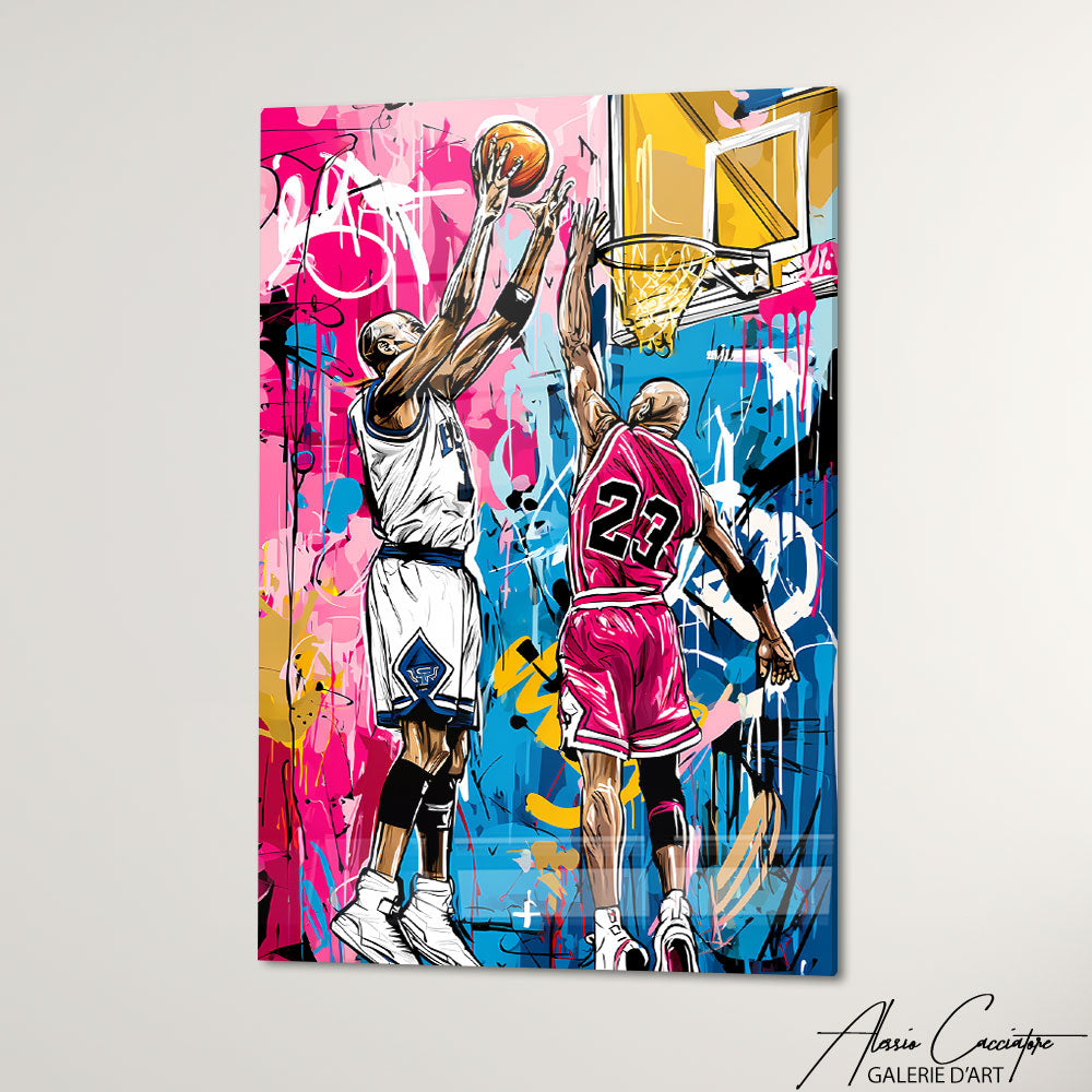 Notre tableau basket enfant montre deux joueurs en plein duel sous le panier dans un univers coloré. Ludique et expressif, il séduit petits et grands amateurs de sport. Parfait pour une chambre ou un espace jeune et moderne.
