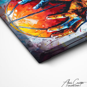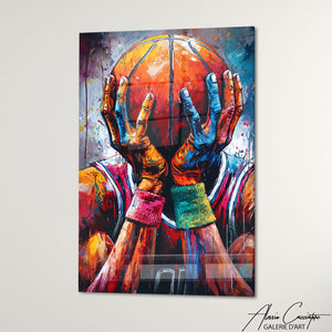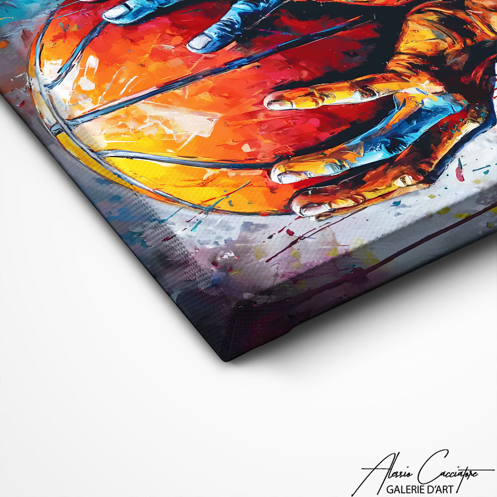 Notre tableau basketteur met en scène un joueur cachant son visage derrière un ballon coloré en style street art. Expressif et percutant, il attire le regard et dégage énergie et mystère. Une œuvre idéale pour une déco moderne.
