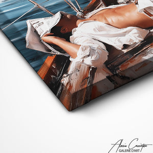 Notre tableau luxe voilier illustre un homme allongé sur un voilier, profitant du soleil dans une ambiance estivale et raffinée. Entre détente et élégance, cette œuvre incarne l’art de vivre méditerranéen dans toute sa splendeur.