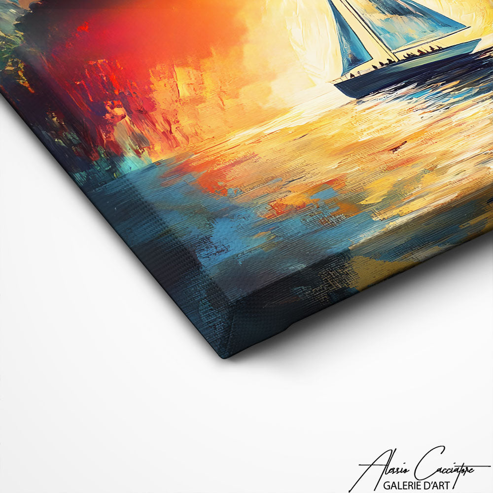 Notre grand tableau bateau navigue dans une grotte mystérieuse aux reflets modernes abstraits. Cette aventure maritime captive le regard et stimule l'imaginaire, parfaite pour créer un focal point dramatique dans votre salon ou bureau d'aventurier.