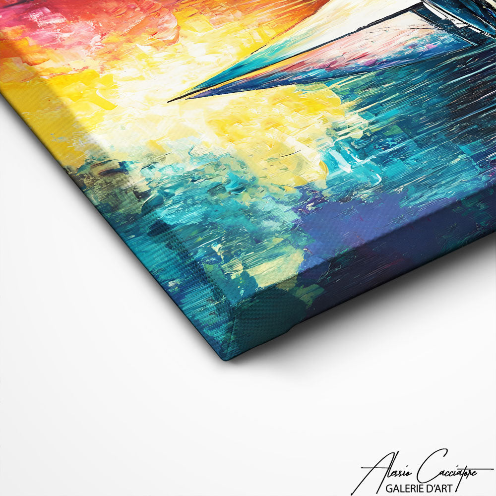 Notre tableau de bateau en mer glisse sur des eaux tranquilles aux reflets multicolores. Cette zenitude maritime apaise instantanément l'atmosphère, créant ce havre de paix décoratif idéal pour votre chambre ou espace méditation.