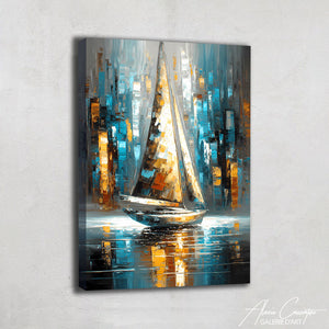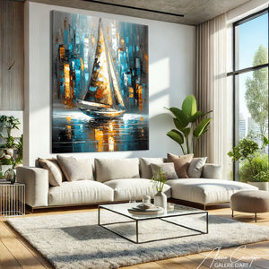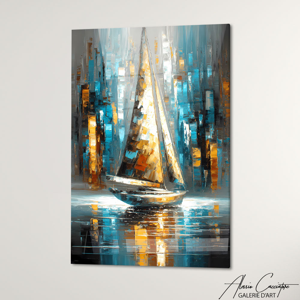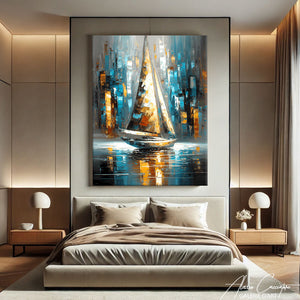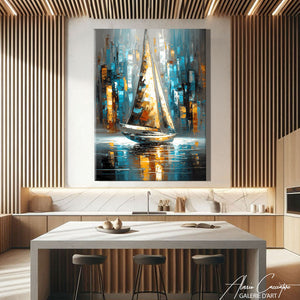 Notre tableau vertical bateau illustre un voilier coloré en bleu abstrait. Élégant et expressif, il évoque voyage et liberté. Une pièce décorative raffinée, idéale pour une décoration contemporaine.
