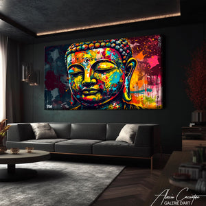 Le Bouddha, symbole de paix et de sérénité, est ici représenté dans un style pop art vibrant. Ce tableau fusionne la tranquillité du Bouddha avec l'énergie du pop art, créant une œuvre visuellement captivante et spirituellement enrichissante.