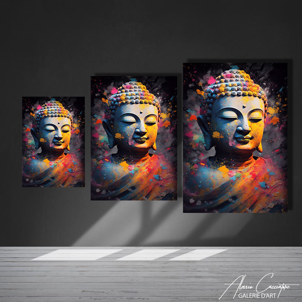 Pour ce tableau Bouddha, le buste émerge d'un fond noir intense, le rendant presque mystique accompagné par des éclats de peinture, comme des étoiles scintillantes ou des pensées éphémères.