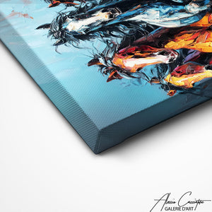 Notre tableau abstrait bleu présente quatre chevaux galopant abstraits ! Cette œuvre équestre transforme votre mur en galerie d'art équin dynamique. La puissance du galop sublimée par l'abstraction moderne et mouvementée. L'art équestre qui inspire liberté !