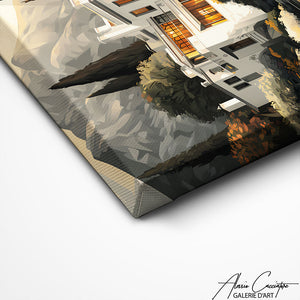 Notre tableau carré moderne présente une villa luxueuse en bord de mer avec un bateau et des montagnes en fond. Élégant et exclusif, il respire prestige et modernité. Un choix parfait pour un intérieur raffiné et contemporain.