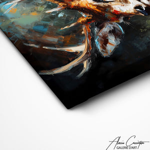 Ce tableau captivant offre une représentation saisissante d'un cerf moderne, avec ses bois majestueux témoignant de la force et de la beauté de cet animal emblématique.