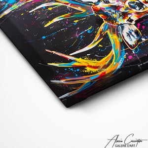 Ce tableau cerf coloré mélange des teintes audacieuses et vives, capturant l’animal dans une interprétation artistique pleine de vie. Il s'intègre parfaitement dans un intérieur moderne ou artistique, apportant énergie et éclat.