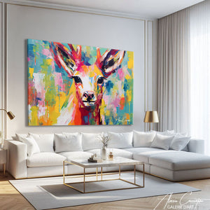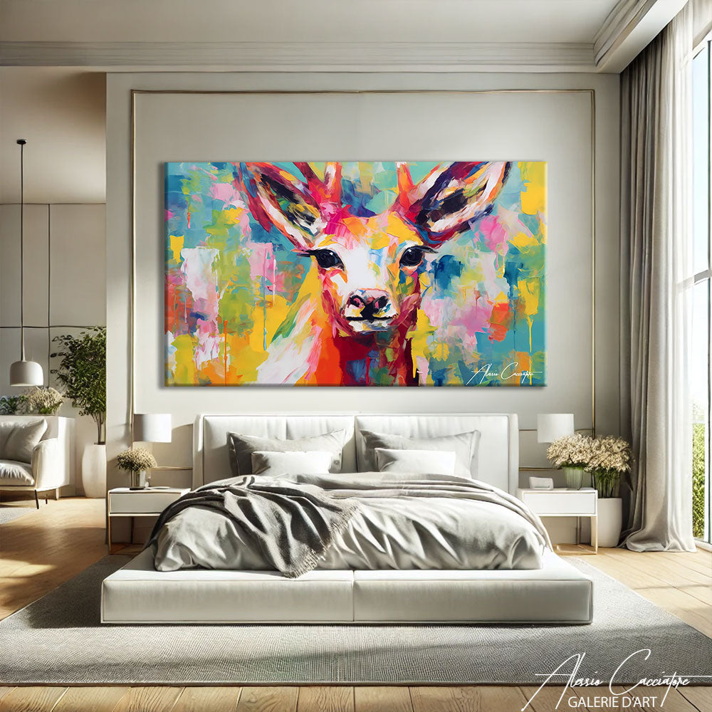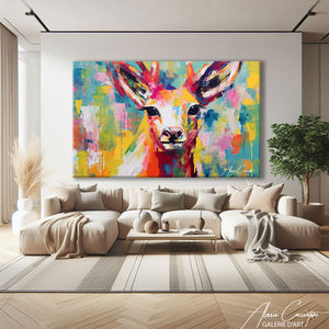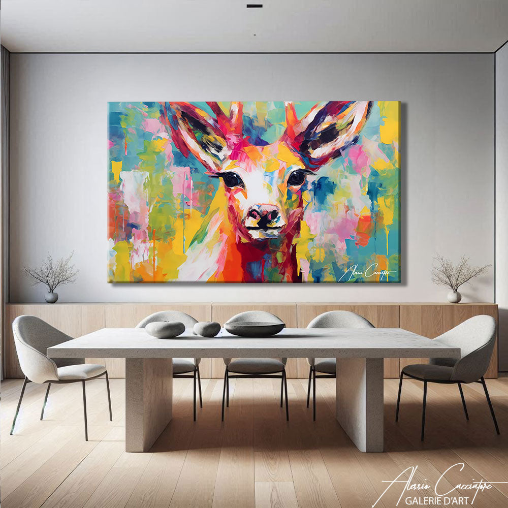 Notre Tableau Cerf Artiste dévoile un regard profond et captivant, sublimé par une explosion de couleurs intenses et lumineuses. Les nuances de jaune, de rose, de turquoise et d’orange créent une composition expressive qui attire immédiatement l’attention. Chaque détail du regard et des bois apporte force et sensibilité à l’ensemble. Idéal pour dynamiser un salon, un bureau ou une chambre, ce visuel artistique insuffle énergie et modernité à votre décoration murale.