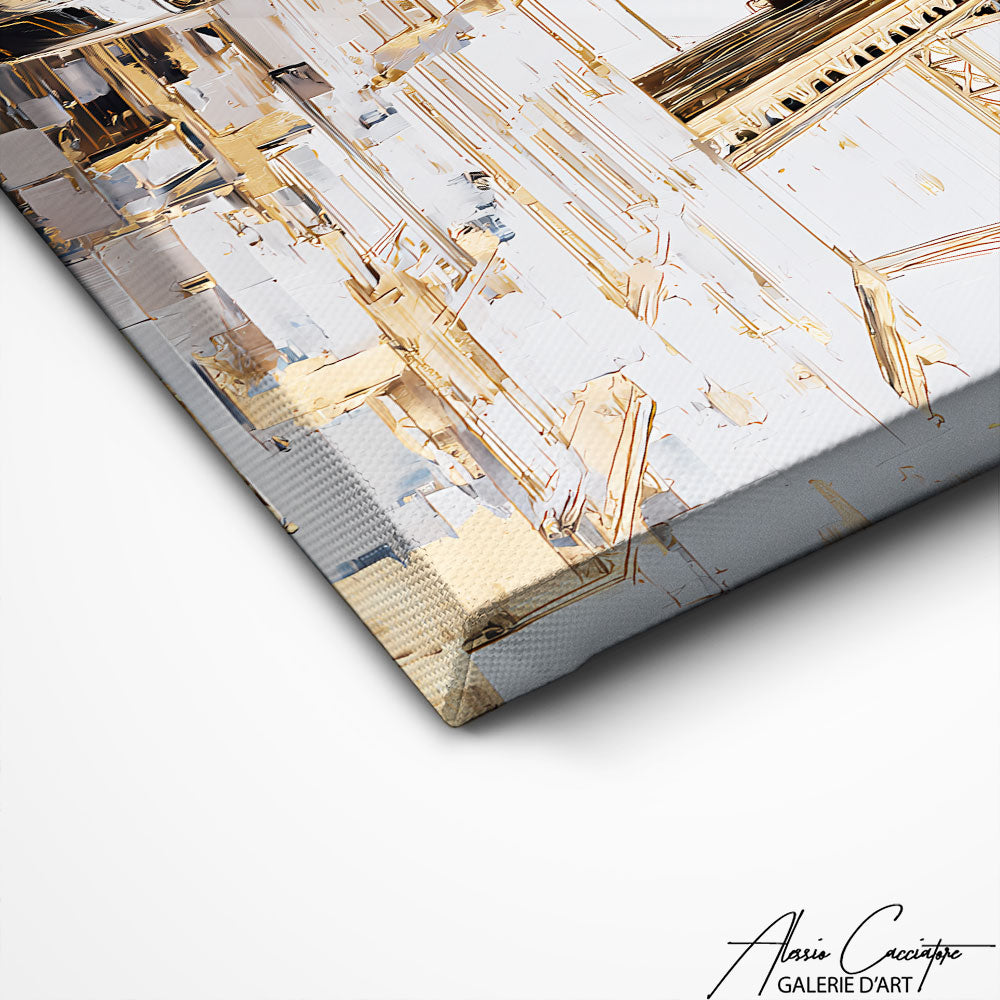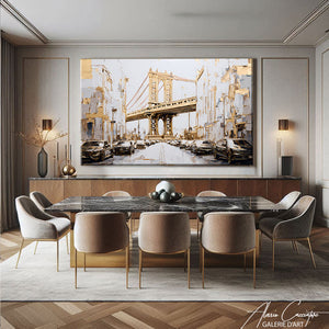 Notre tableau déco chambre présente le Brooklyn Bridge dans un style abstrait luxueux. Une vision artistique et moderne qui illumine vos murs. Une pièce idéale pour une décoration chic et contemporaine.