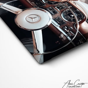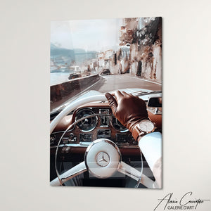 Notre tableau déco chic illustre une scène d’intérieur avec une voiture de sport rétro, des gants et une montre de luxe. Puissant et raffiné, il dégage élégance et modernité. Une œuvre parfaite pour une décoration de caractère.