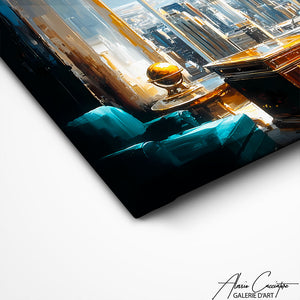 Notre tableau bureau professionnel illustre un bureau new-yorkais doré avec vue sur la skyline. Élégant et prestigieux, il respire succès et modernité. Une œuvre idéale pour un espace de travail chic et inspirant.