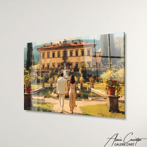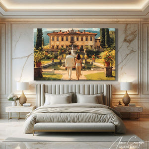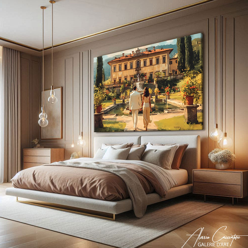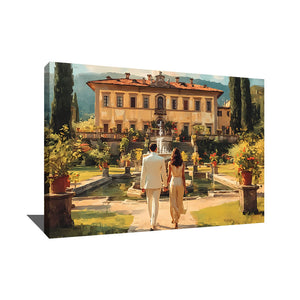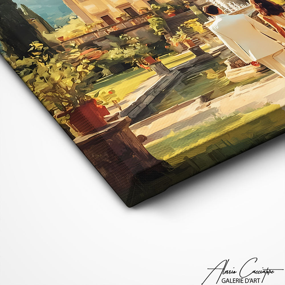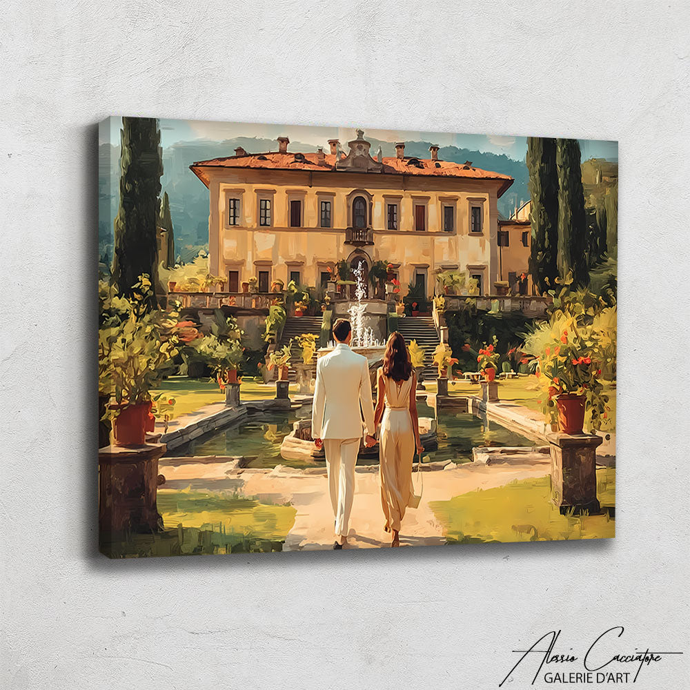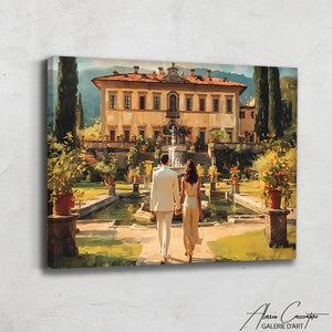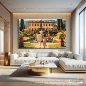 Notre tableau chic et design illustre un couple romantique de dos dans le jardin d’une villa italienne élégante. Raffiné et poétique, il dégage charme et douceur. Une œuvre idéale pour une décoration sophistiquée.