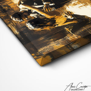 Notre tableau danseurs capture la sensualité d'un couple en mouvement sur fond chocolat. Cette romance artistique réchauffe immédiatement votre chambre ou salon, insufflant passion et élégance dans votre décoration la plus intime.
