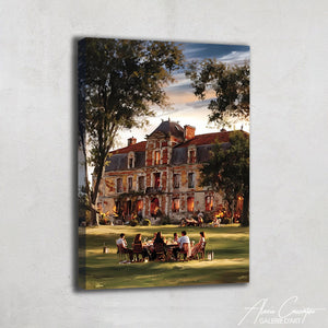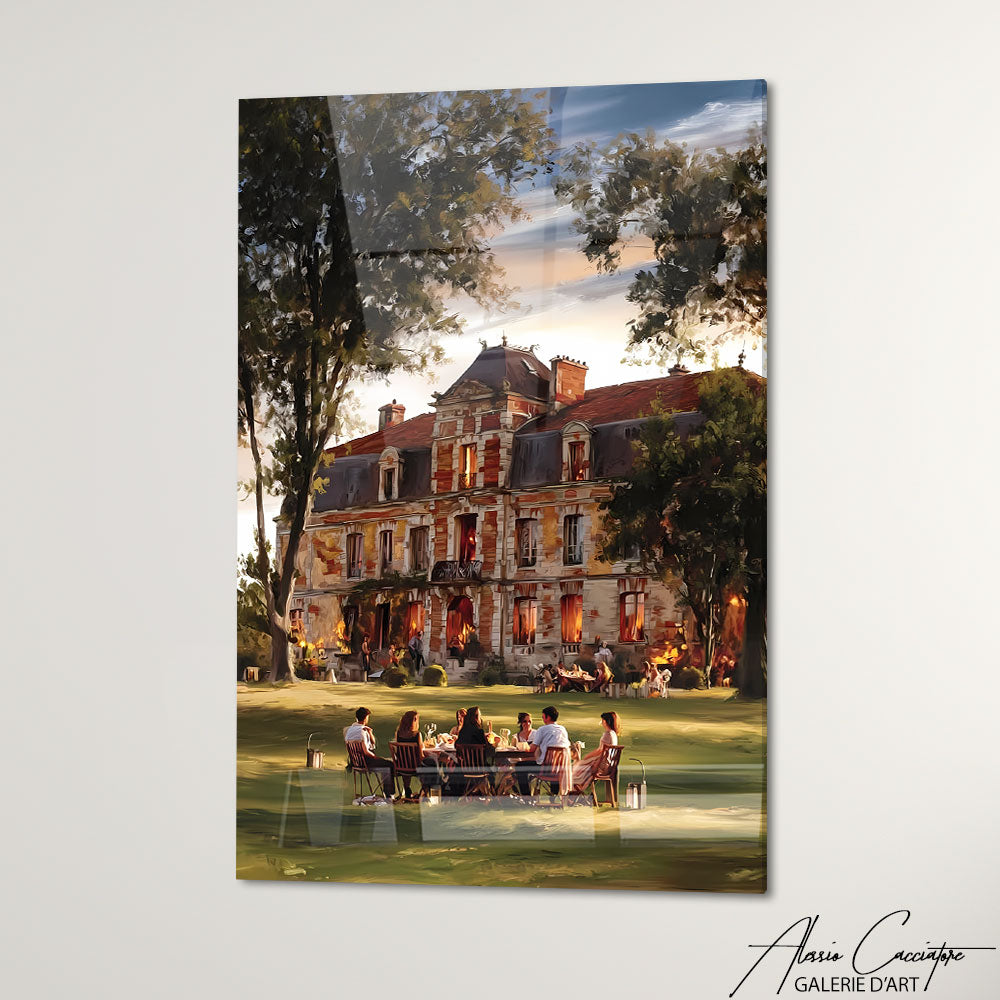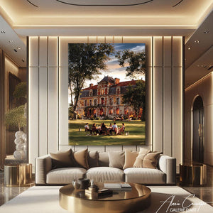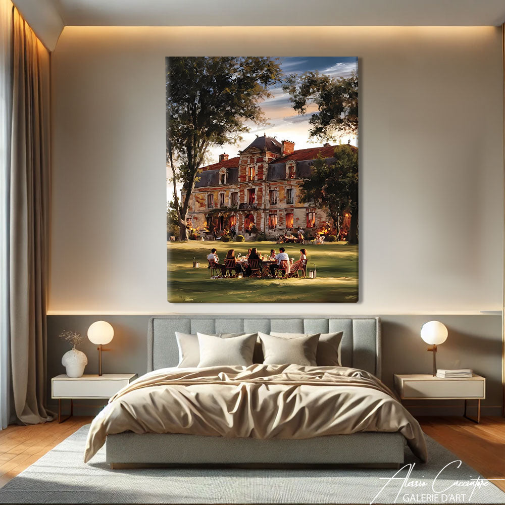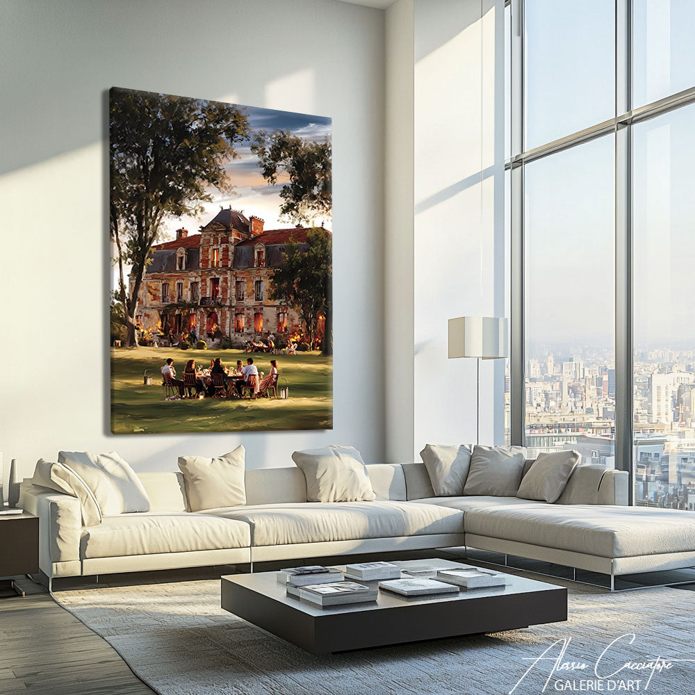 Notre tableau décoratif chic représente un manoir élégant avec, au premier plan, une table remplie d’invités distingués. Prestige et raffinement s’y mêlent. Une œuvre idéale pour donner noblesse à votre décoration.