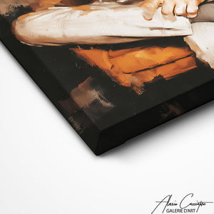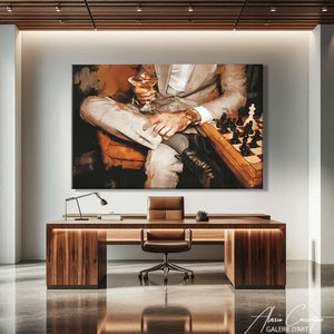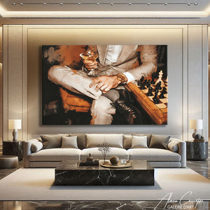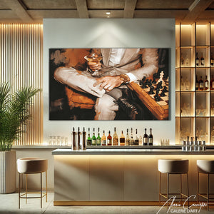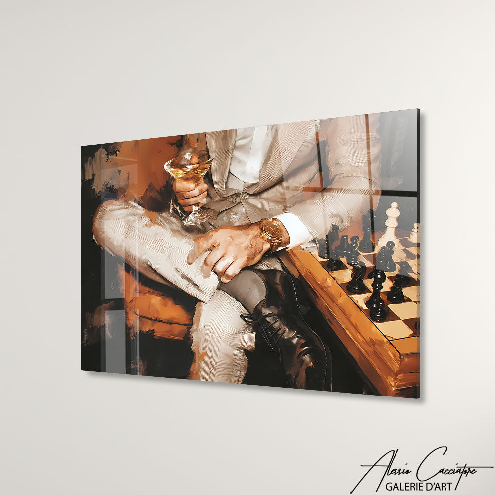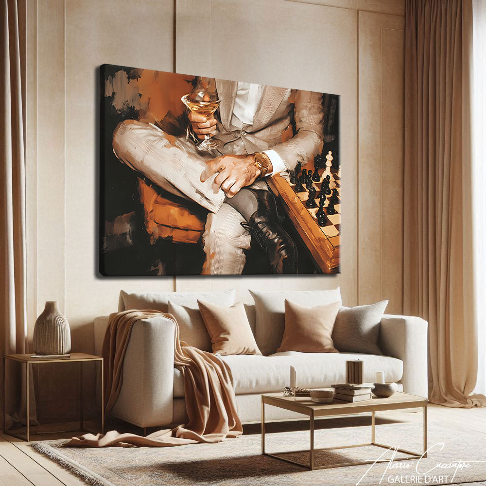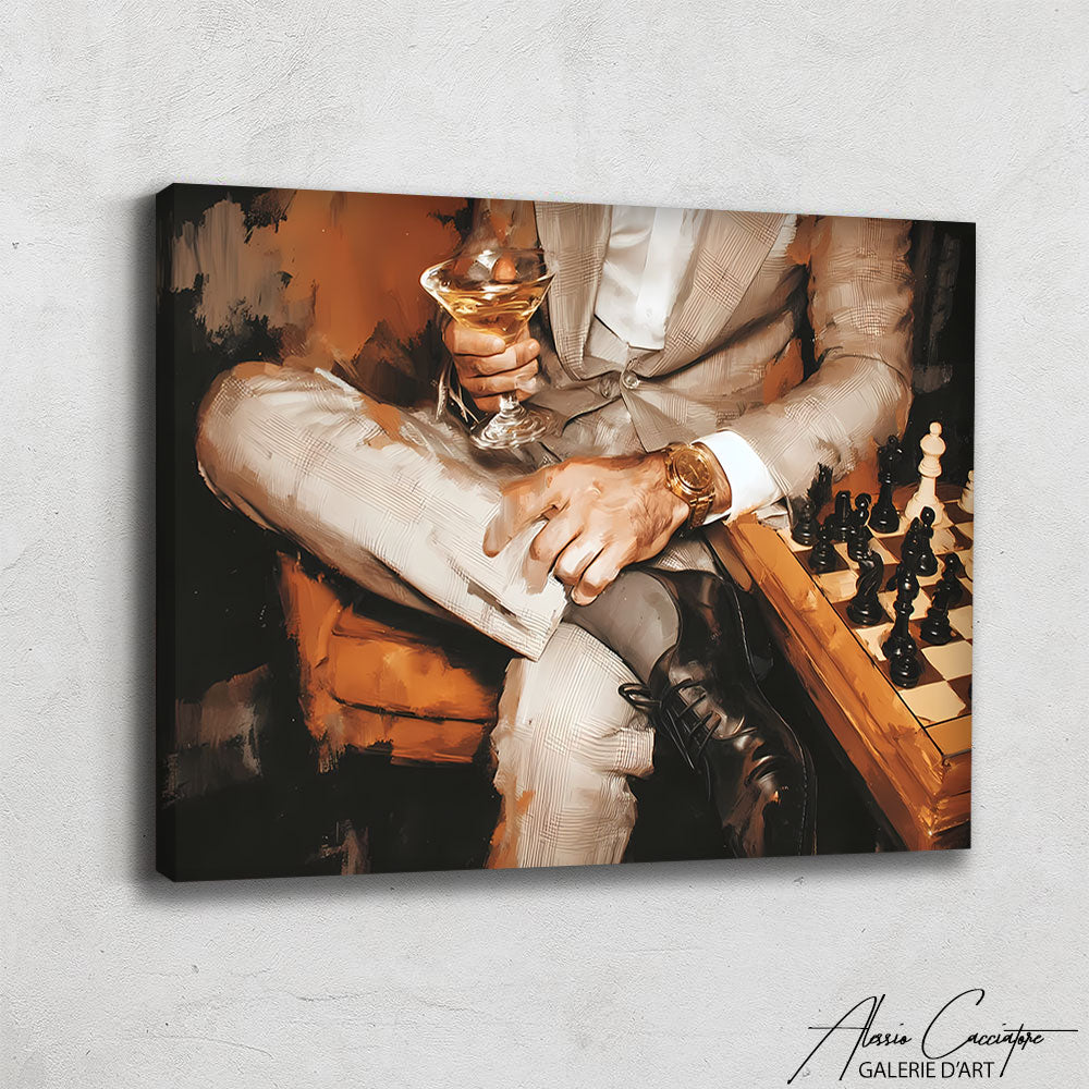 Notre tableau décoration chic illustre un homme en costume, montre de luxe au poignet, cocktail et échiquier devant lui. Élégant et raffiné, il incarne le style mondain et distingué. Parfait pour impressioner vos invités.