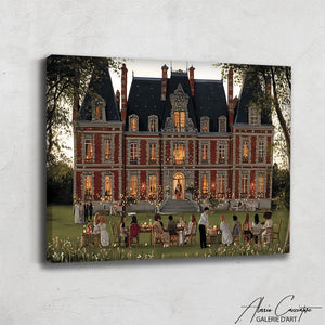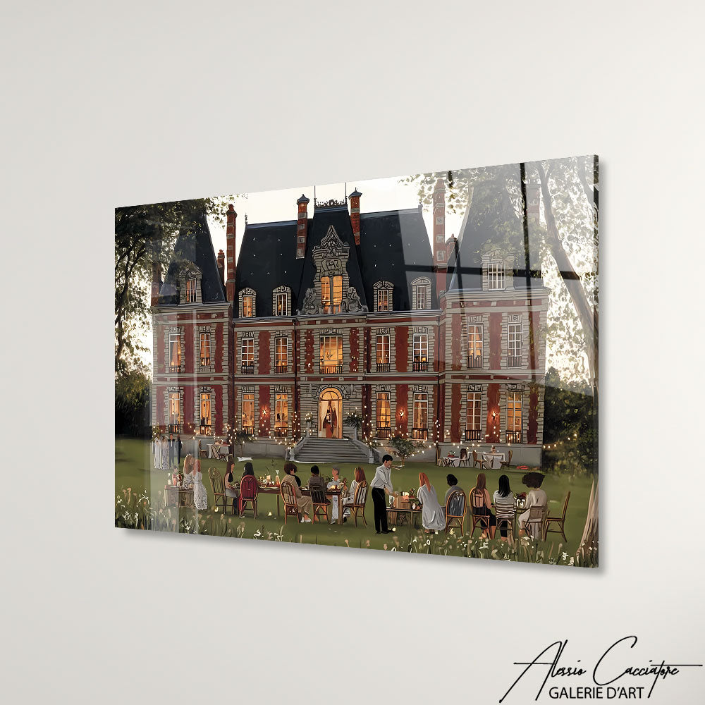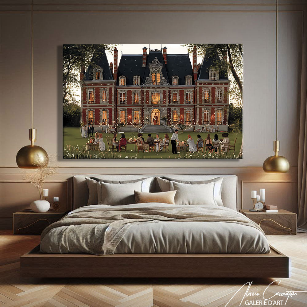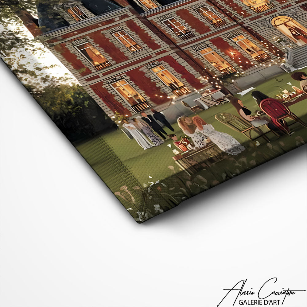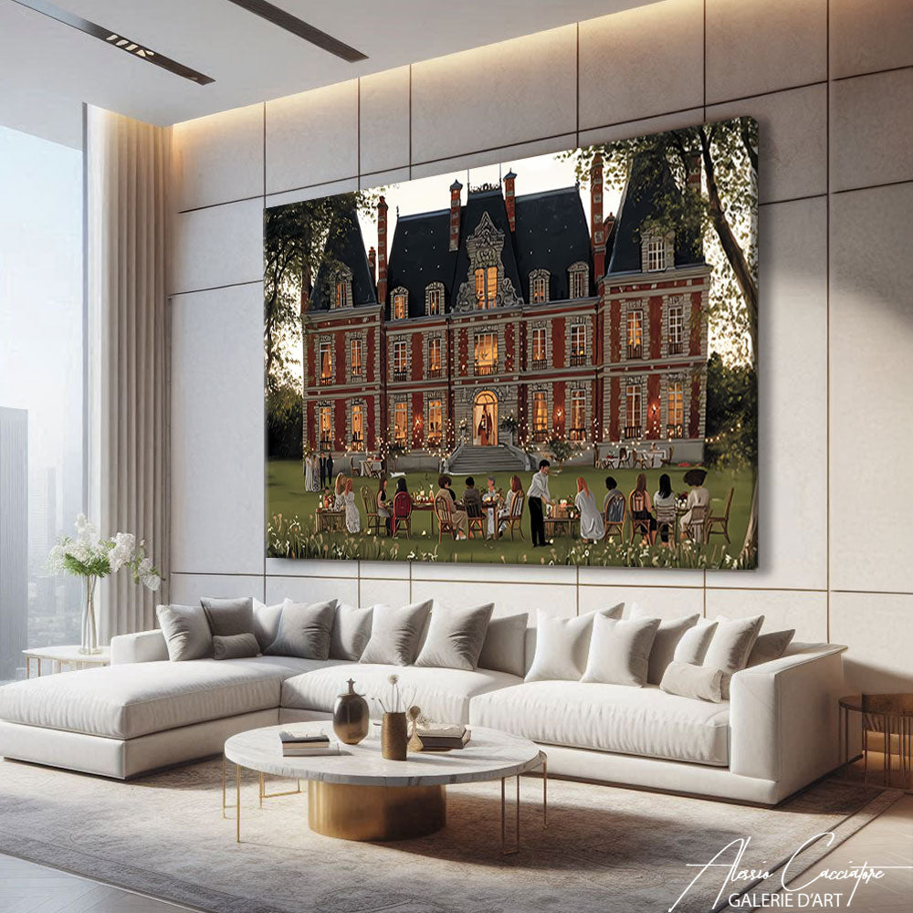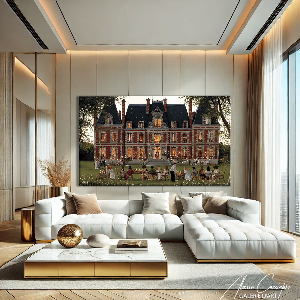 Notre tableau elegant salon illustre un manoir mondain avec, au jardin, une grande tablée d’invités élégants. Sophistiqué et raffiné, il dégage prestige et exclusivité.