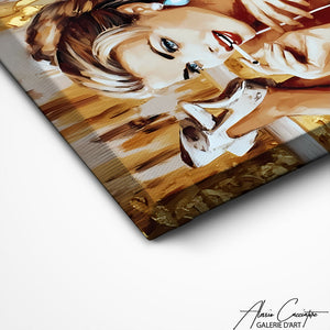 Notre tableau femme chic met en avant une femme blonde glamour et élégante, allongée sur une plage abstraite, magazine à la main. Raffiné et sensuel, il respire élégance et séduction. Parfait pour un intérieur moderne.