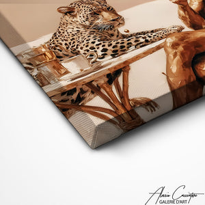 Notre tableau luxe élégant met en scène un homme élégant prenant un café aux côtés d’un léopard. L’univers beige et doré confère une allure puissante et distinguée. Parfait pour sublimer un intérieur haut de gamme empreint de caractère et d’élégance.