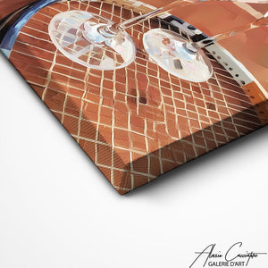 Notre tableau martini déco met en avant deux cocktails posés sur une raquette de tennis, sur un terrain de terre battue. Original et raffiné, il marie lifestyle et élégance. Une œuvre idéale pour une décoration chic et moderne.