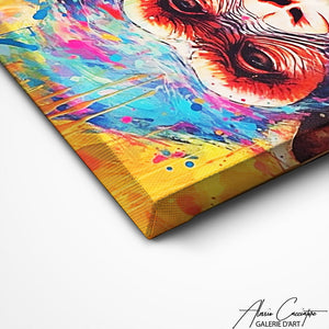 Dans un tourbillon de couleurs vives, le sujet émerge, vibrant d'émotions. L'artiste a souhaité à travers, chaque nuance, chaque détail, raconter une histoire d'audace et de vivacité dan ce tableau de singe coloré.
