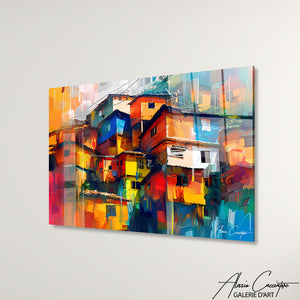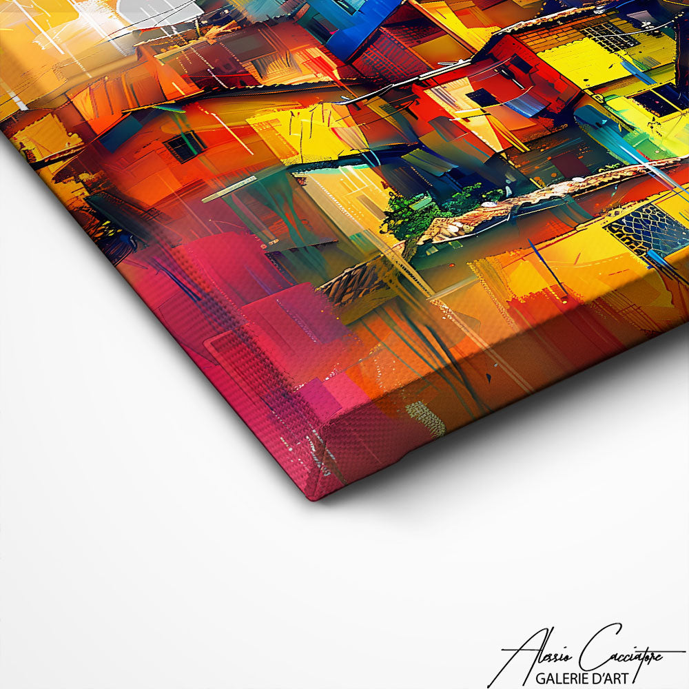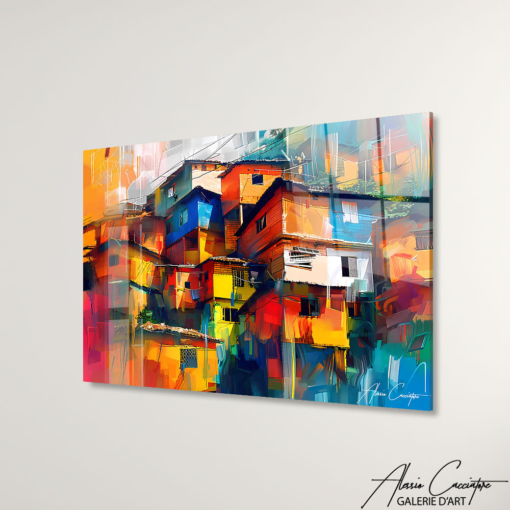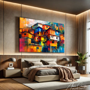 Notre tableau abstrait coloré représente une favela stylisée dans un univers abstrait, où chaque maison devient un patchwork vivant avec ses formes géométriques. L’ensemble dégage une énergie joyeuse et urbaine. Parfait pour une déco contemporaine et expressive. Ce tableau transforme l’architecture populaire en œuvre d’art éclatante.
