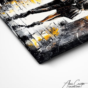 Notre tableau montre un couple marchant sous la pluie, unis sous un parapluie, dans une ambiance douce et poétique. Les reflets mouillés, les silhouettes rapprochées et les couleurs délicates créent une scène pleine de charme. Parfait pour une déco romantique et intime. Ce tableau réchauffe le cœur.