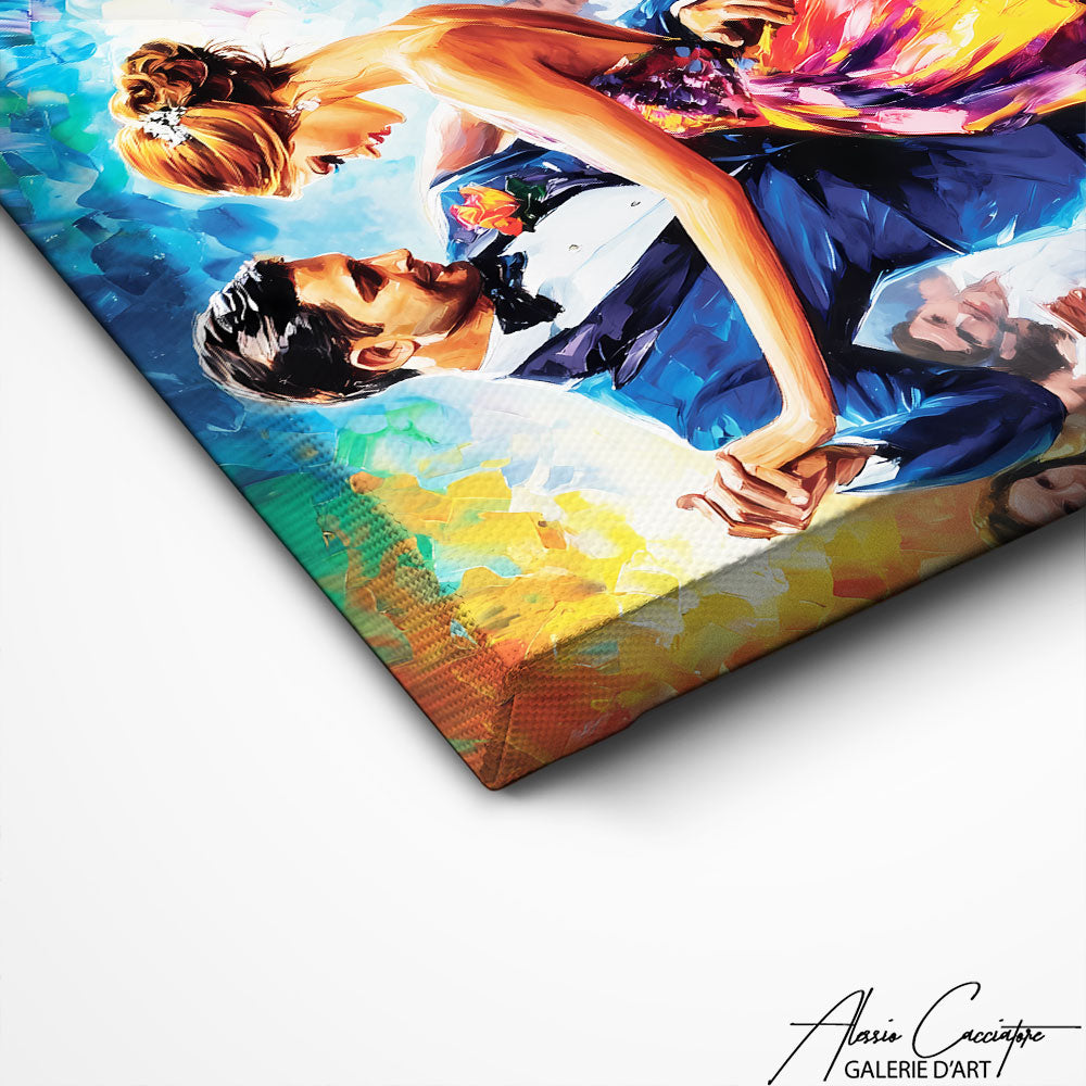 Notre tableau illustre un couple de danseurs enlacés, figés dans un mouvement élégant et passionné. Leurs corps synchronisés dégagent énergie et harmonie dans une composition rythmée. Idéal pour une décoration dynamique et romantique. Ce tableau fait danser les émotions sur vos murs.