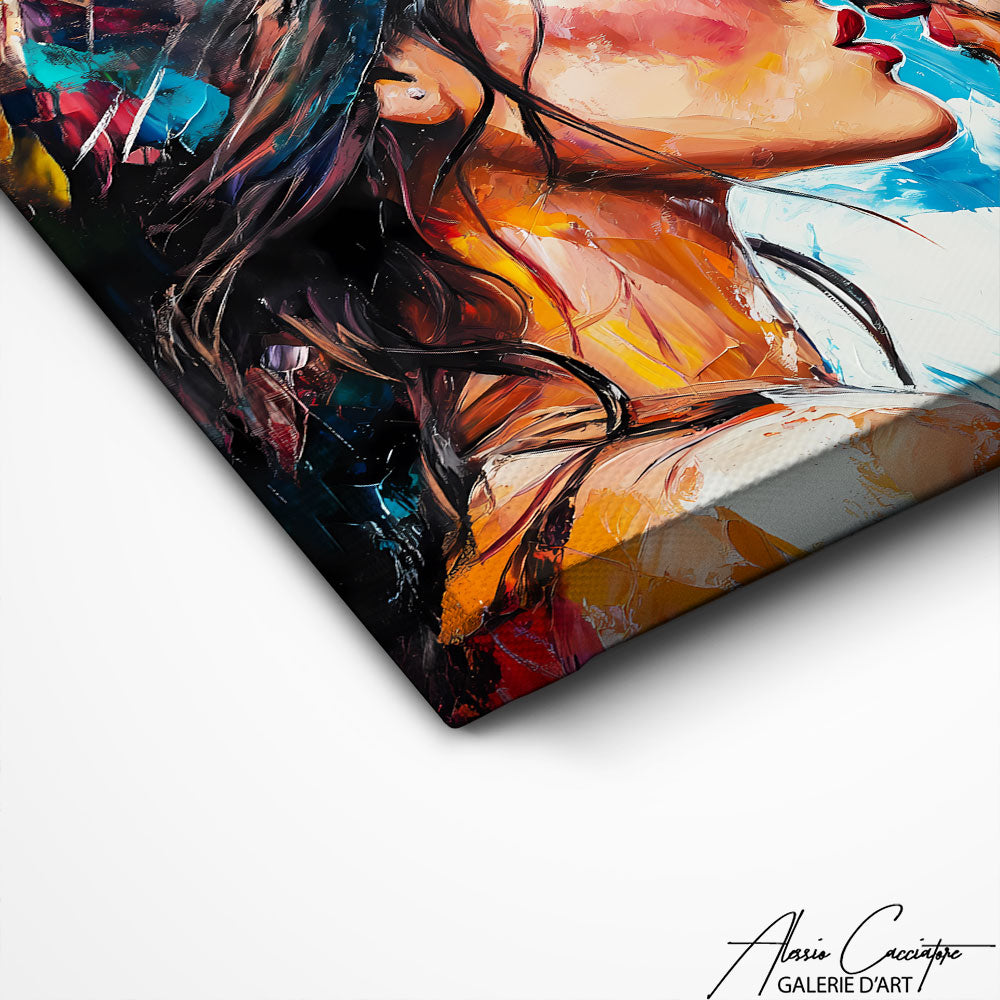 Notre œuvre représente un couple dans une scène pleine d’émotion et de symbolisme. À travers un style réaliste abstrait, elle exprime la connexion unique entre deux êtres. Idéal pour une décoration empreinte de sensibilité, ce tableau évoque l’amour sous toutes ses formes.