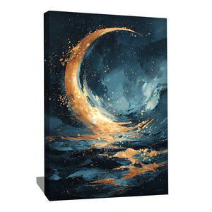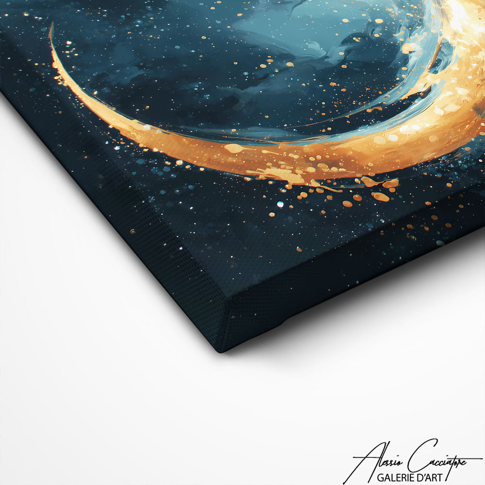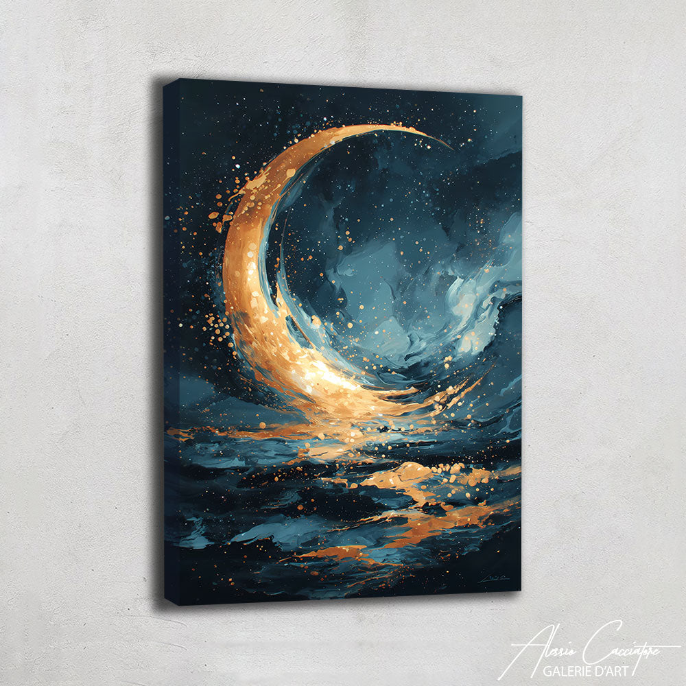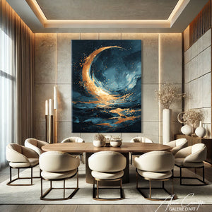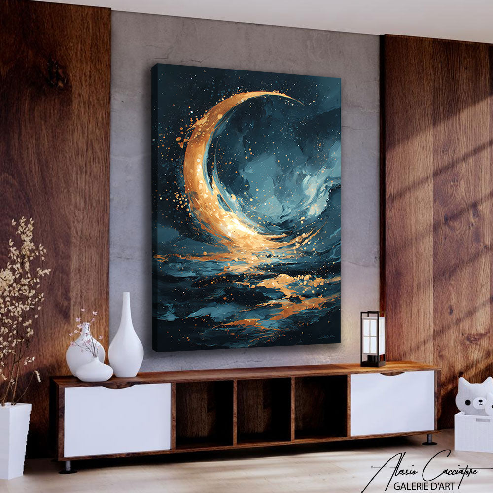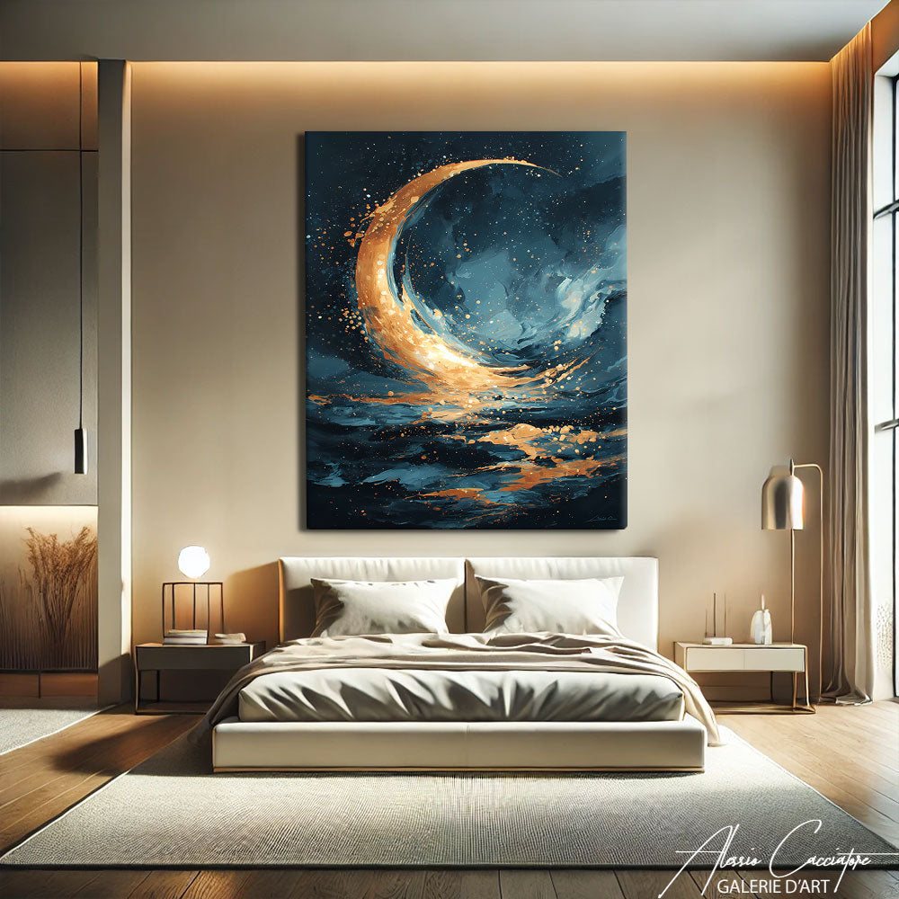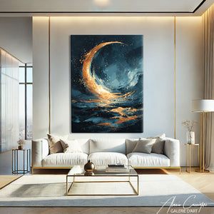 Notre tableau XXL abstrait présente un croissant de lune céleste ! Cette œuvre cosmique transforme votre mur en galerie d'art spatial monumentale. Format XXL pour une immersion totale dans cet univers lunaire mystique. L'art céleste qui transporte !